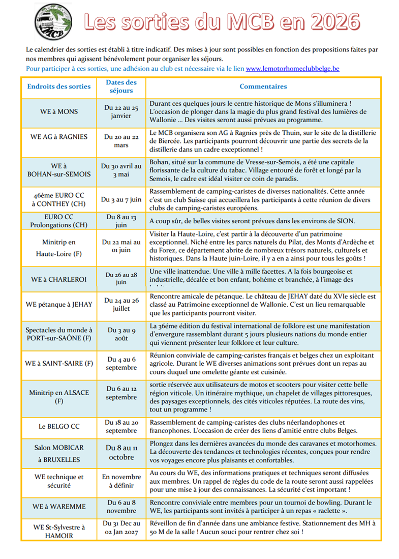 Les sorties du M.C.B. sont organisées par des motorhomistes du club. Ils ne sont pas des professionnels du tourisme et invitent bénévolement les autres membres du club.