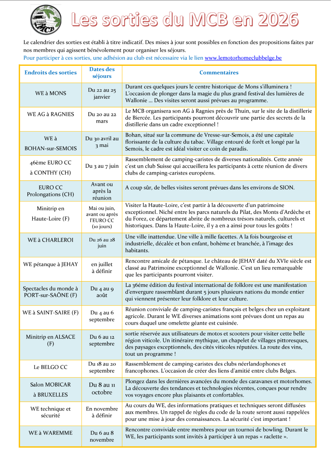Les sorties du M.C.B. sont organisées par des motorhomistes du club. Ils ne sont pas des professionnels du tourisme et invitent bénévolement les autres membres du club.